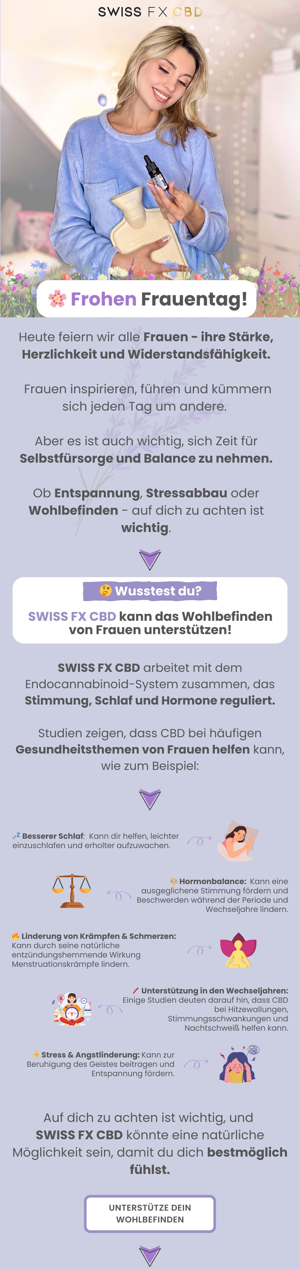 An diesem besonderen Tag feiern wir alle Frauen! Nimm dir einen Moment für dich und entdecke, wie SWISS FX CBD dein Wohlbefinden unterstützen kann.