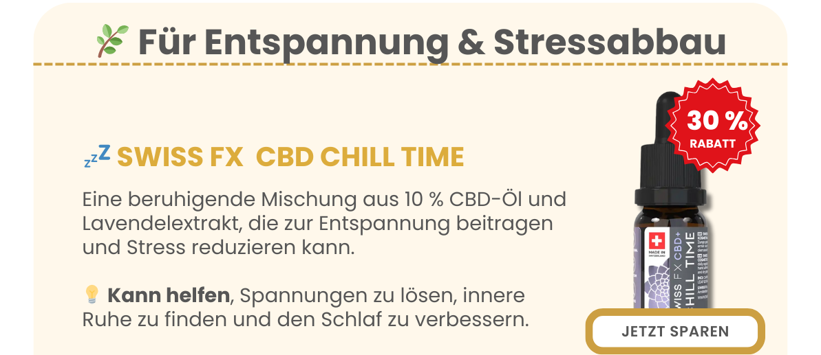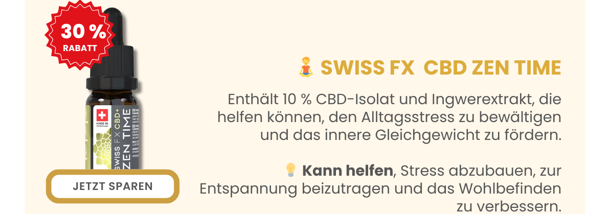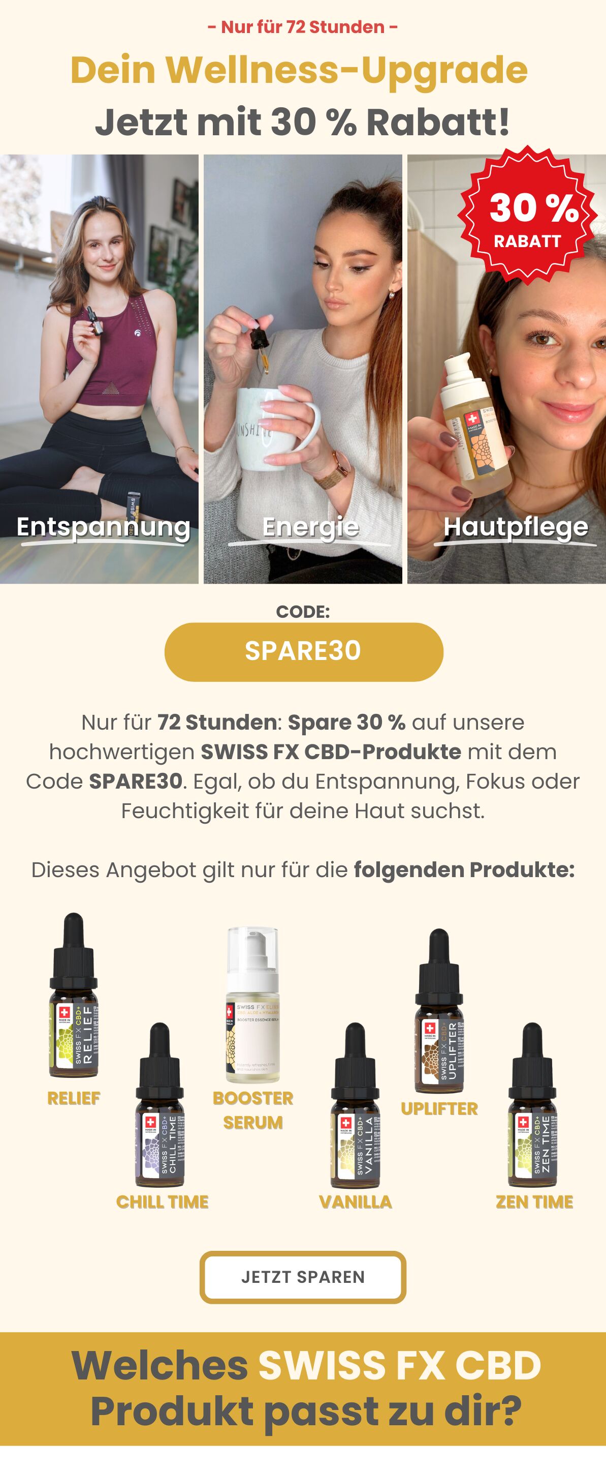 Jetzt ist deine Chance! Die nächsten 72 Stunden bekommst du 30 % Rabatt auf unsere beliebtesten SWISS FX CBD-Öle und Hautpflegeprodukte mit dem Code SPARE30 – entwickelt, um dein Wohlbefinden auf natürliche Weise zu unterstützen.